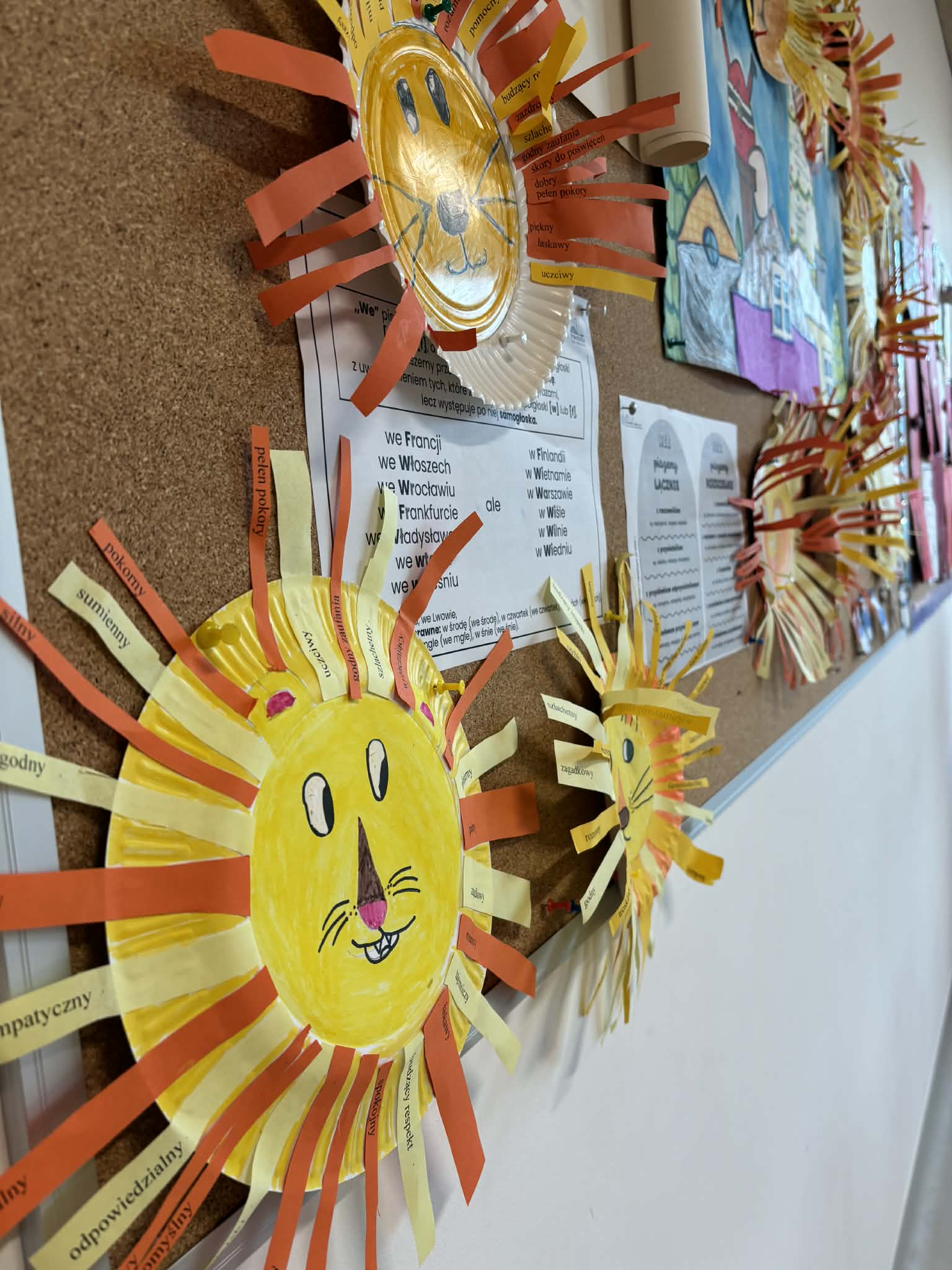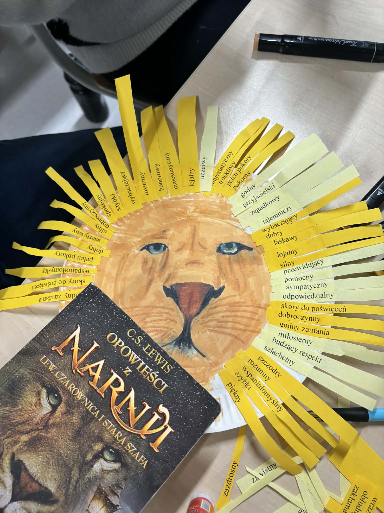 Uczniowie mieli za zadanie stworzyć na talerzykach wizerunek Aslana, który zakończył wieczną zimę w Narnii i symbolizuje zwycięstwo dobra nad złem. Druga część zadania polegała na wyborze odpowiednich przymiotników oraz stworzeniu z nich grzywy lwa. Jako, że nie wszystkie słowa były dla piątoklasistów jasne, wprowadziliśmy też pracę ze słownikami. Tym sposobem młodzież poznała znaczenia takich wyrazów, jak: asertywny, obłudny, zawistny i majestatyczny.